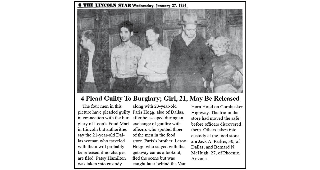Patsy Ruth next made news with four members of the safecracking Parker Gang in the January 23, 1954 Fairbury Nebraska Daily News. Those taken into custody in Lincoln were suspected of an earlier heist in Fairbury in which “the same type explosives and wire had been used as in the Lincoln job.”