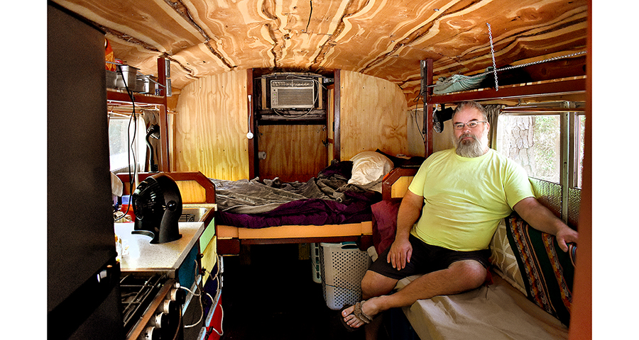 “Everything’s 12-volt but the AC,” he said. The bus gets 10 miles to a gallon. He eats a lot of vegetables, an inexpensive diet developed during his South American training, where “meat is disproportionately expensive.”