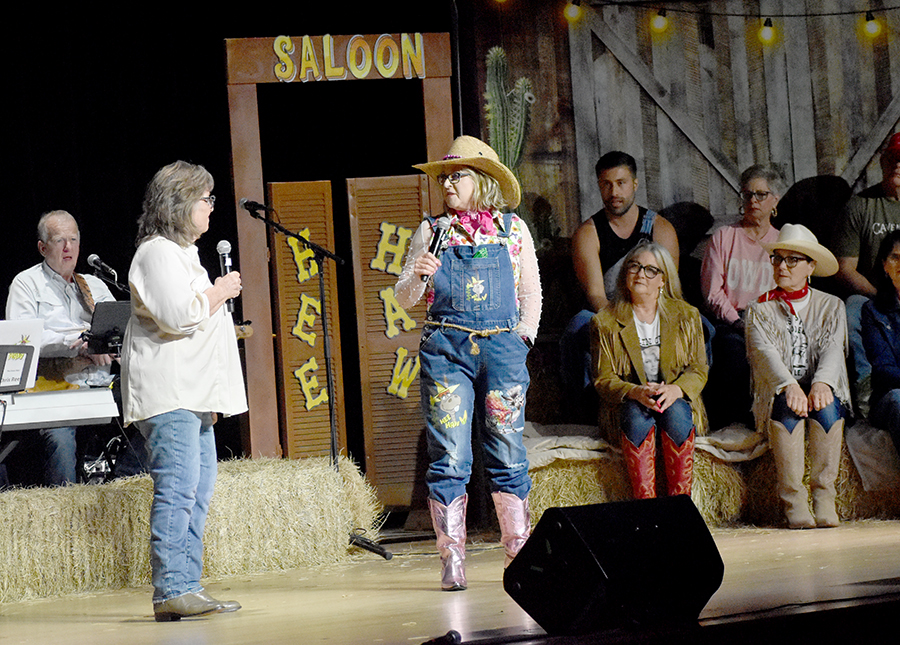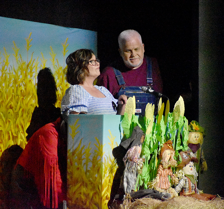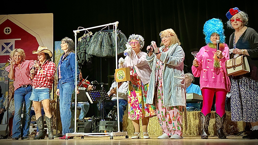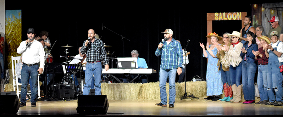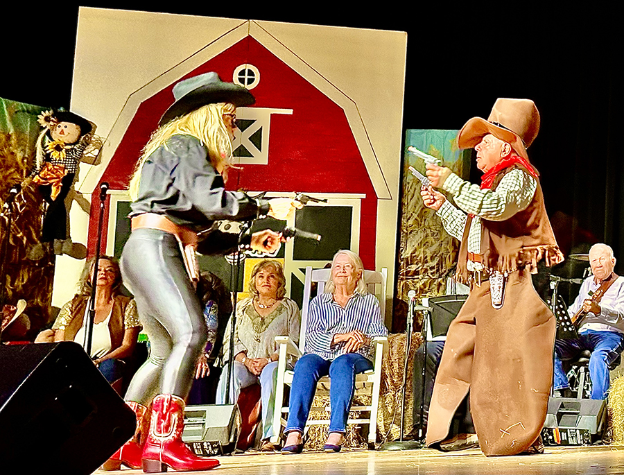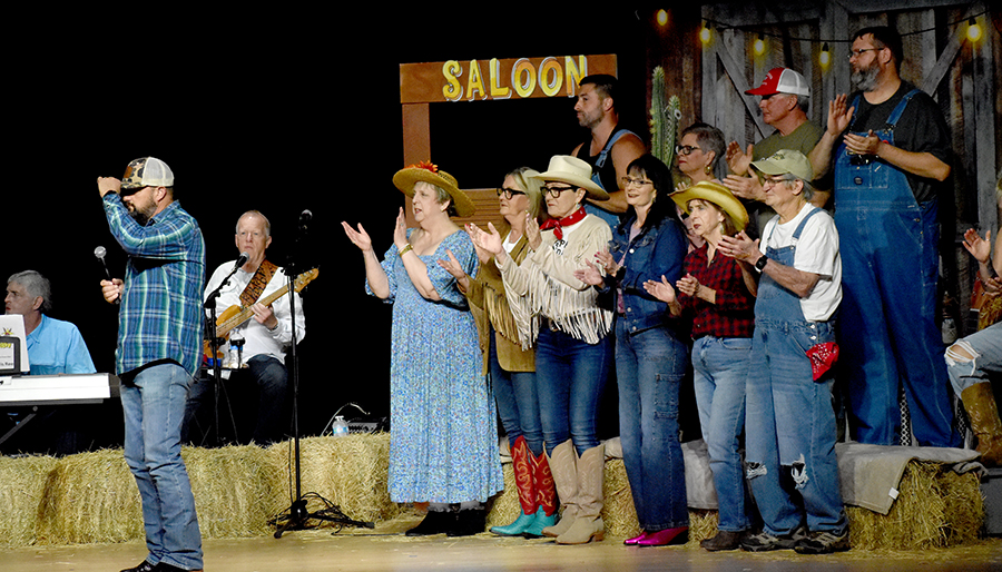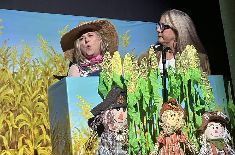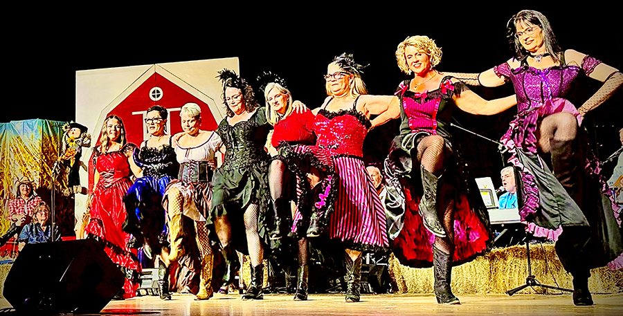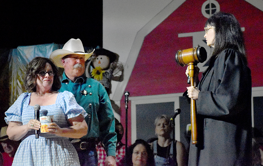 “We’re not the type to repeat gossip, so listen close the first time,” sang those chorus line dancers who doubled as the “Rumors Girls” featuring Mary Collins, Lisa Crain, Deana French, Linda Grundish, Amy Kennington and the versatile District Judge, Angela Saucier, all of them armed with scripted lines in the imaginary world of Kornfield Kounty, the fantasy-for-a-night setting for the citizens of Camp County.