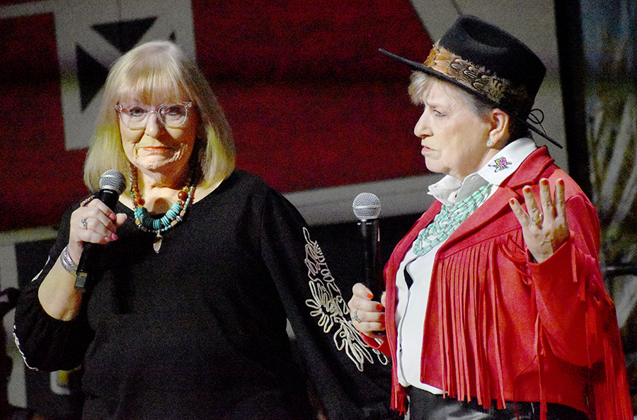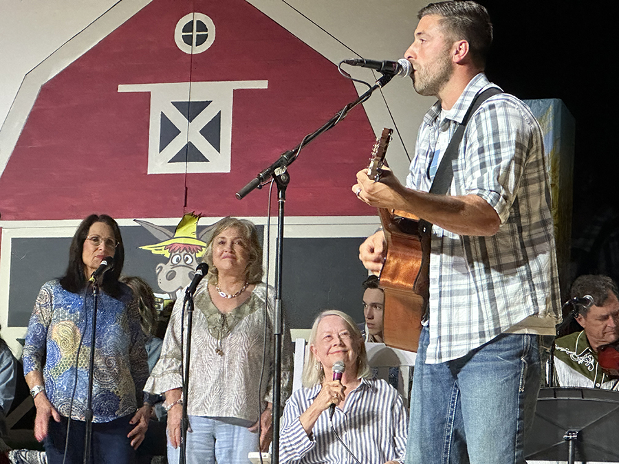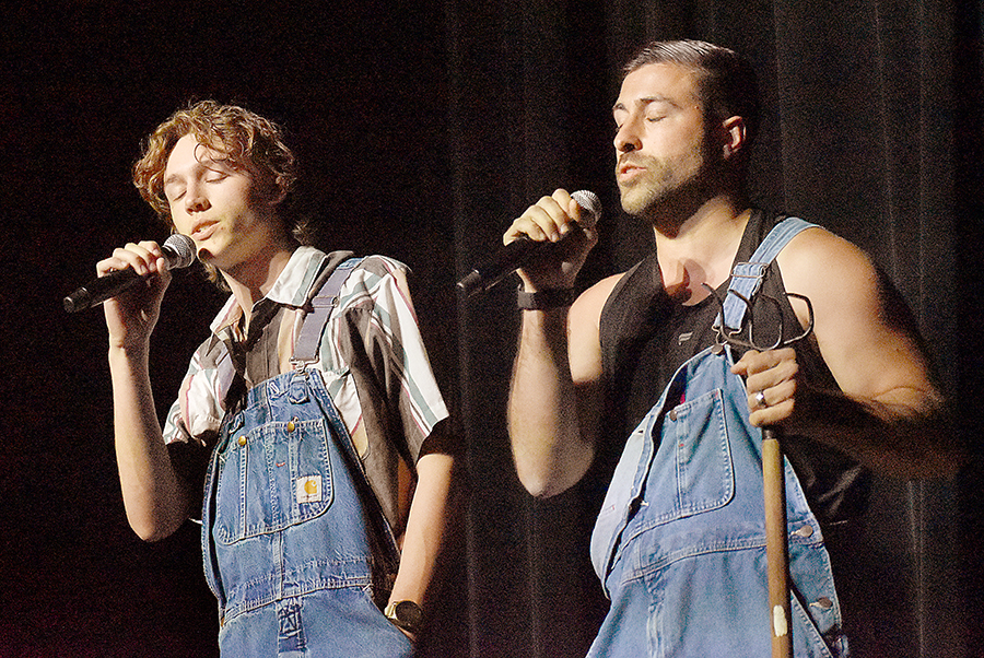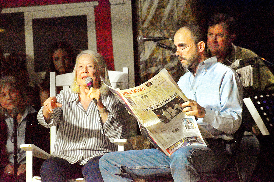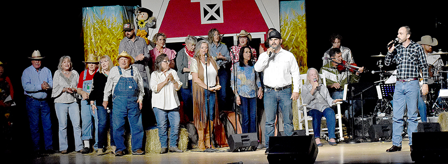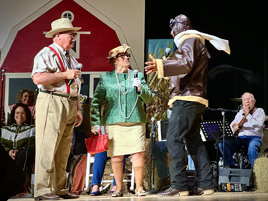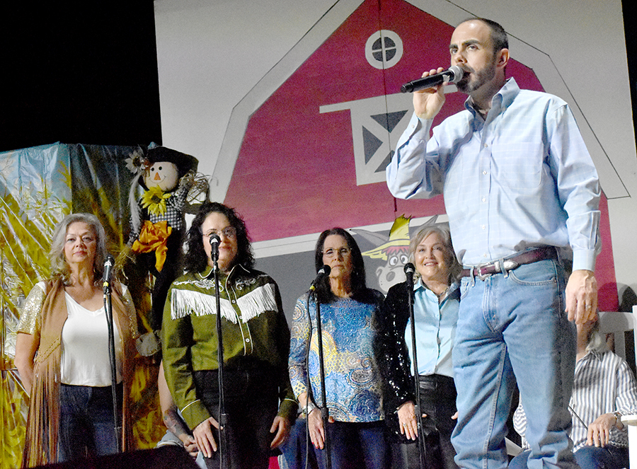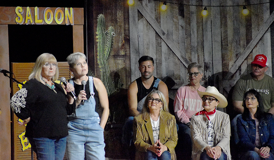 “We’re not the type to repeat gossip, so listen close the first time,” sang those chorus line dancers who doubled as the “Rumors Girls” featuring Mary Collins, Lisa Crain, Deana French, Linda Grundish, Amy Kennington and the versatile District Judge, Angela Saucier, all of them armed with scripted lines in the imaginary world of Kornfield Kounty, the fantasy-for-a-night setting for the citizens of Camp County.