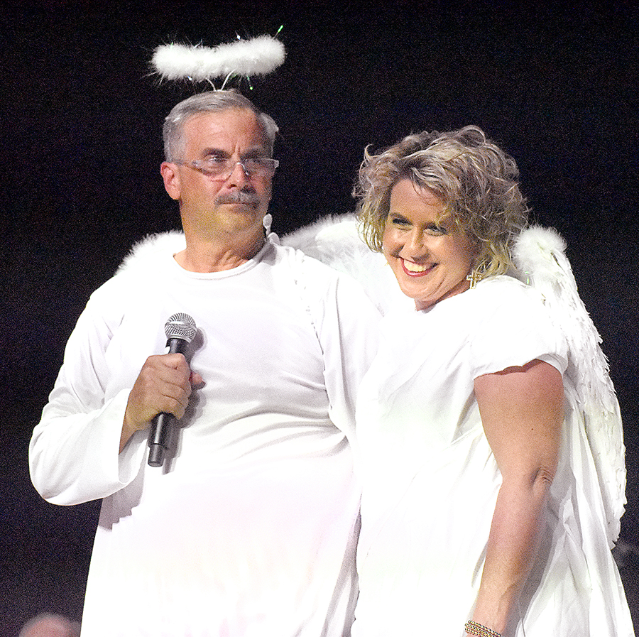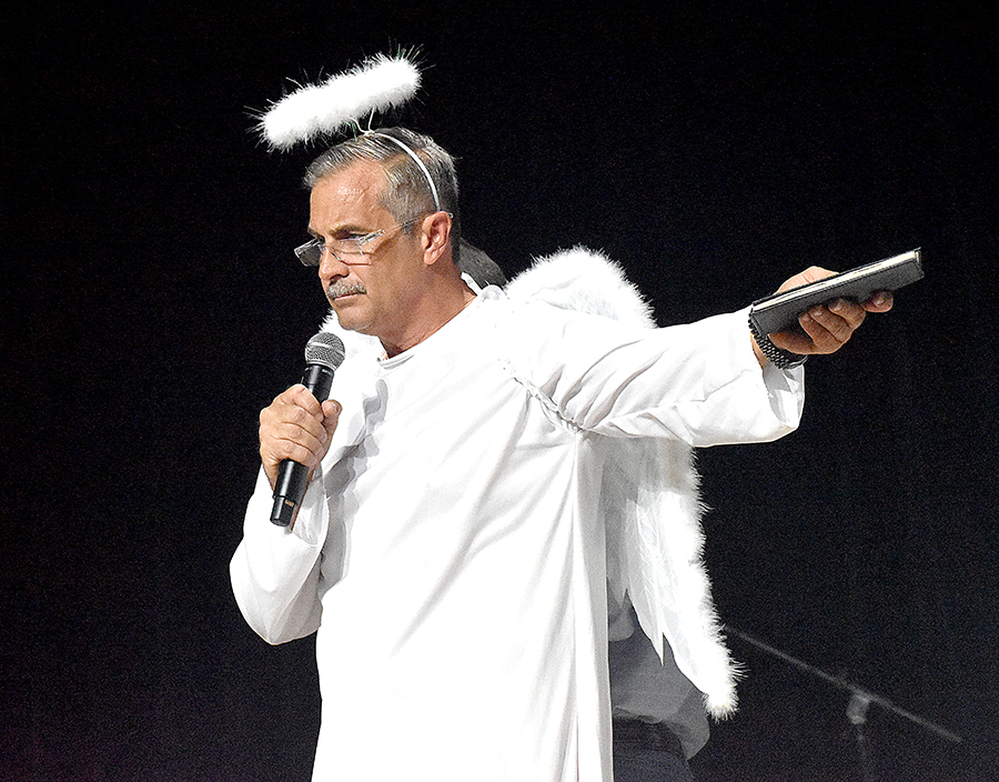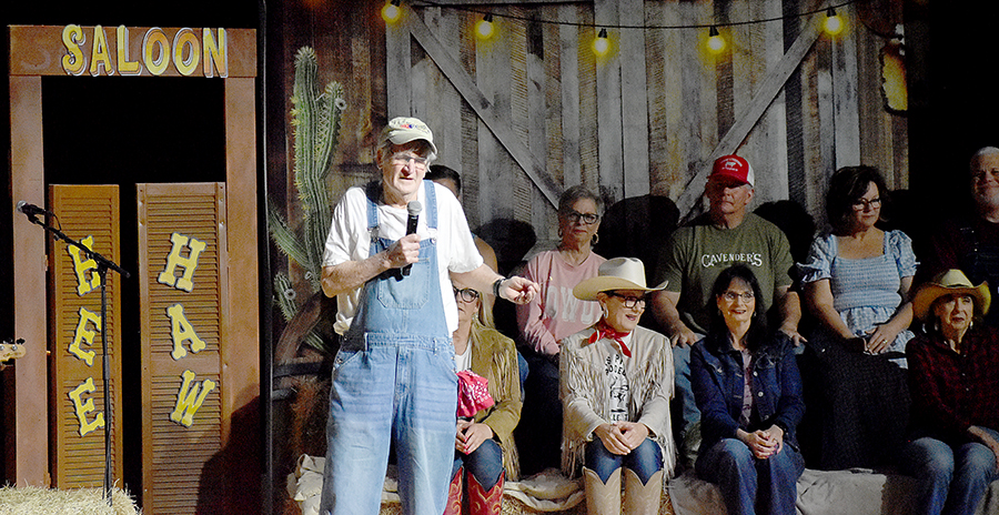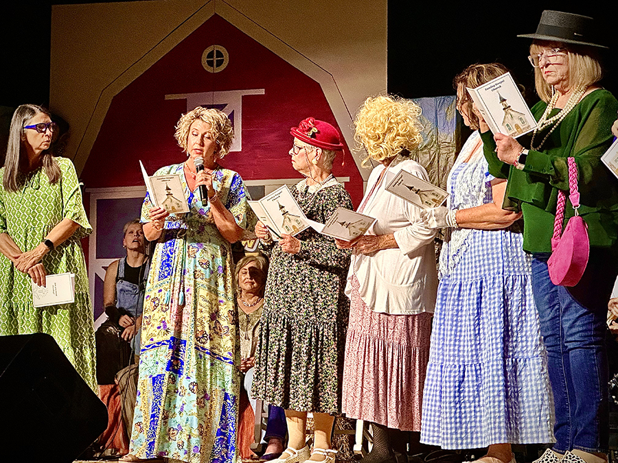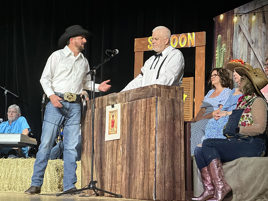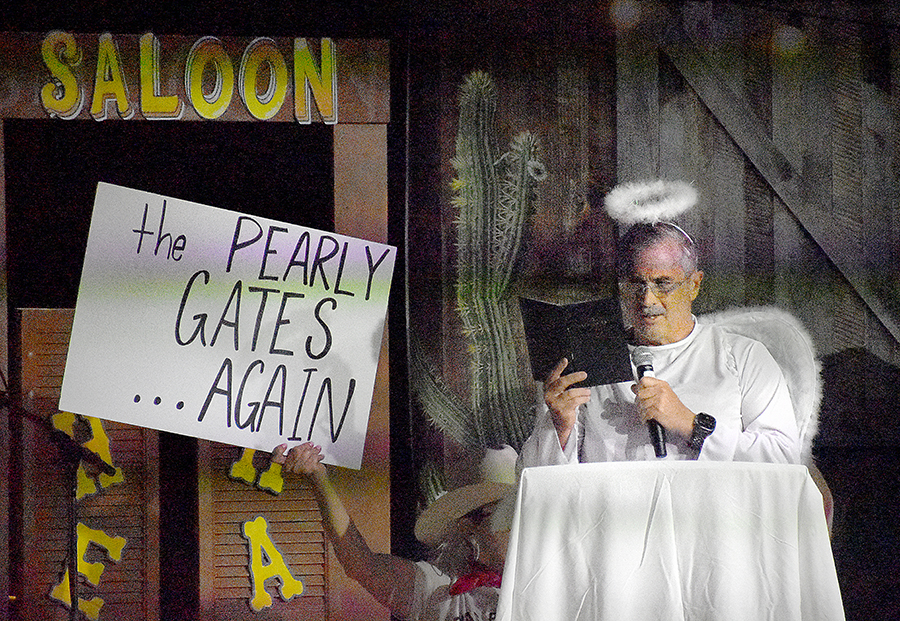 The script assigned the role of Saint Peter working the entry to the Pearly Gates to Shawn Kennington, the town undertaker, in Scene 4, “Buck at the Pearly Gates Borrowed Angels.” The same spirit put Joey Saxon centerstage as bartender at the Dusty Drawers Saloon, complementing Scene 7 in which Denise Reynolds, Patty Hood, Kenya Shane and Kristin Kilburn anchor a musical skit sending Mrs. Saxon to jail for stealing peaches, fodder for Sunday morning-after conversation at Emmanual Baptist.